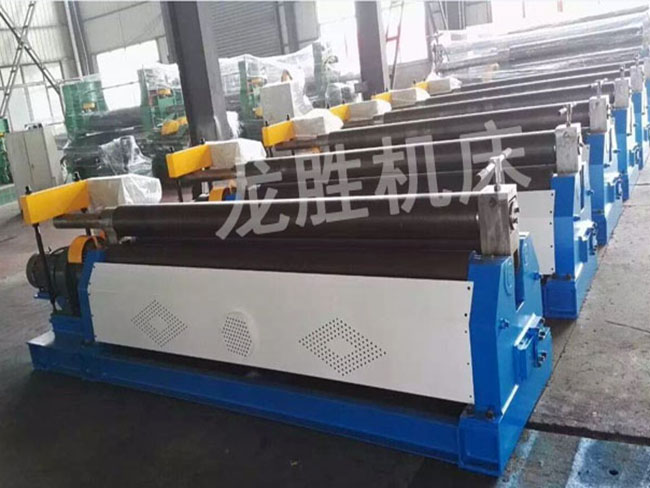機械對稱式卷板機工作原理該機構形式為三輥對稱式,上輥在兩下輥中央對稱位置作垂直升降運動,通過絲桿絲母蝸桿傳動而獲得,兩下輥作旋轉運動,通過減速機的輸出齒輪與下輥齒輪嚙合,為卷制板材提供扭矩。