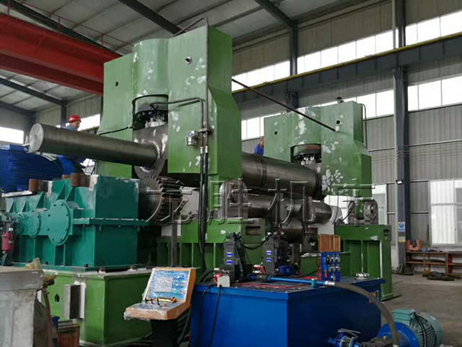 該機屬于液壓型三輥卷板機,用于常溫狀態(tài)下將各種容器用碳鋼、低合金鋼一次上料后不需調頭即完成板材端部預彎、卷圓和矯圓等工序。